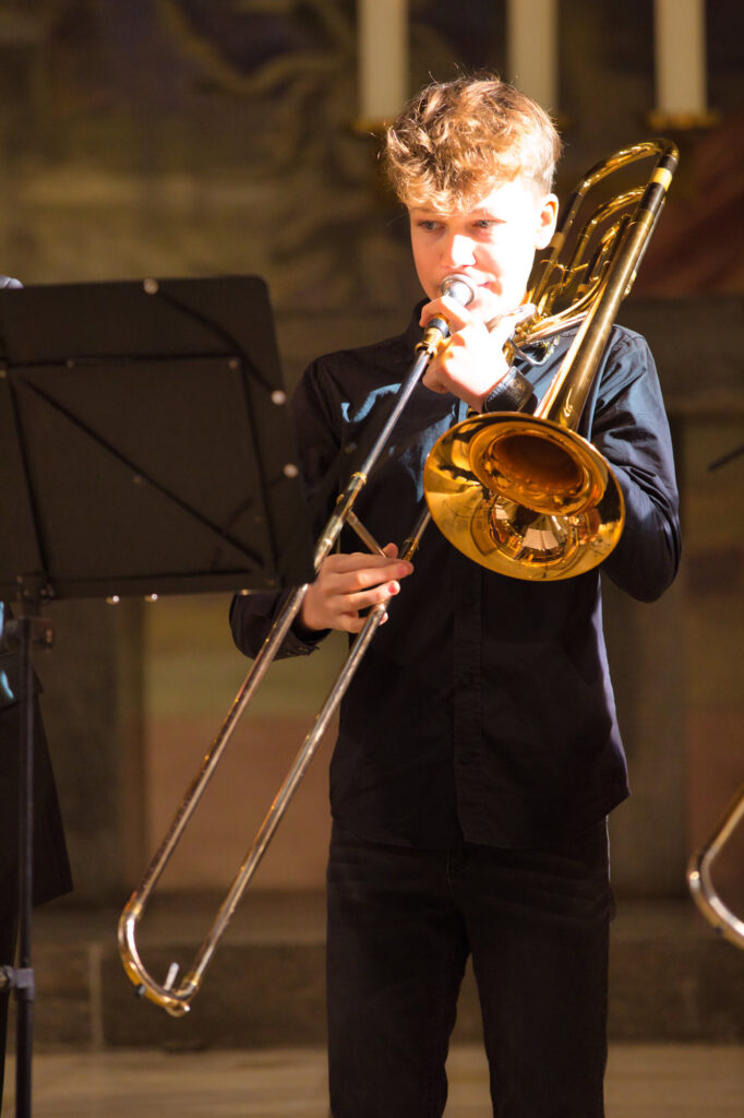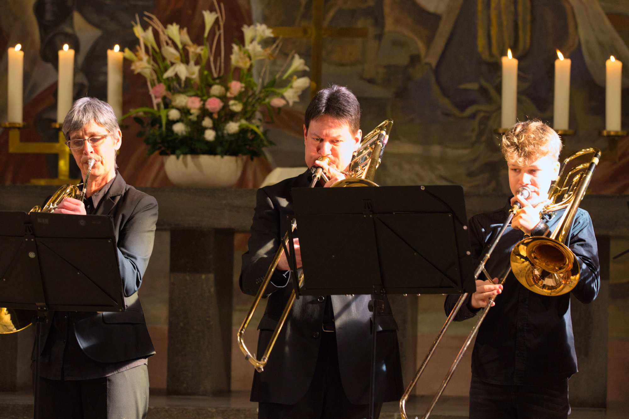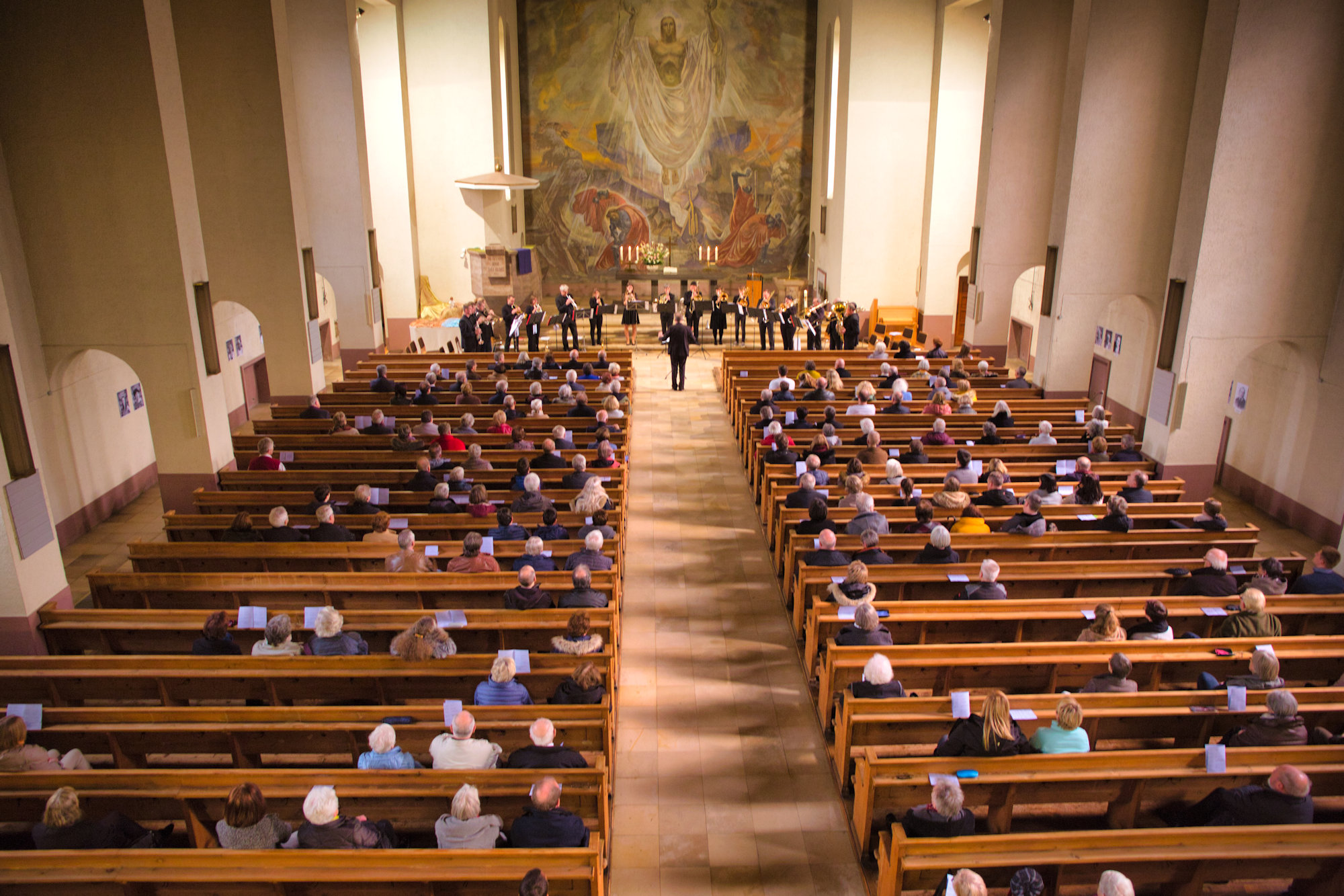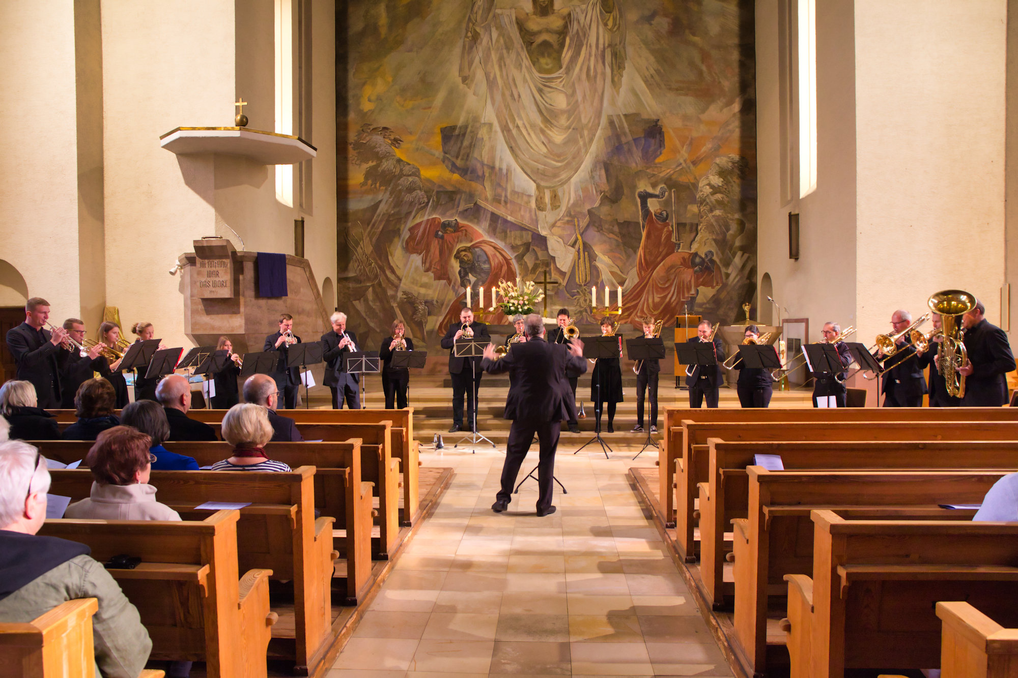 Orgelmusik wechselte mit Stücken des Bezirksbläserchors Bretten-Bruchsal unter der Leitung von Matthias Gromer ab. Thematisch war die Musik passend ausgewählt, Bitte um Frieden, Trauermarsch, Meditationen über Angst, Trost, Hoffnung und Frieden klangen durch die Kirche. Die Komponisten reichten vom 16. Jahrhundert bis in die Gegenwart.
