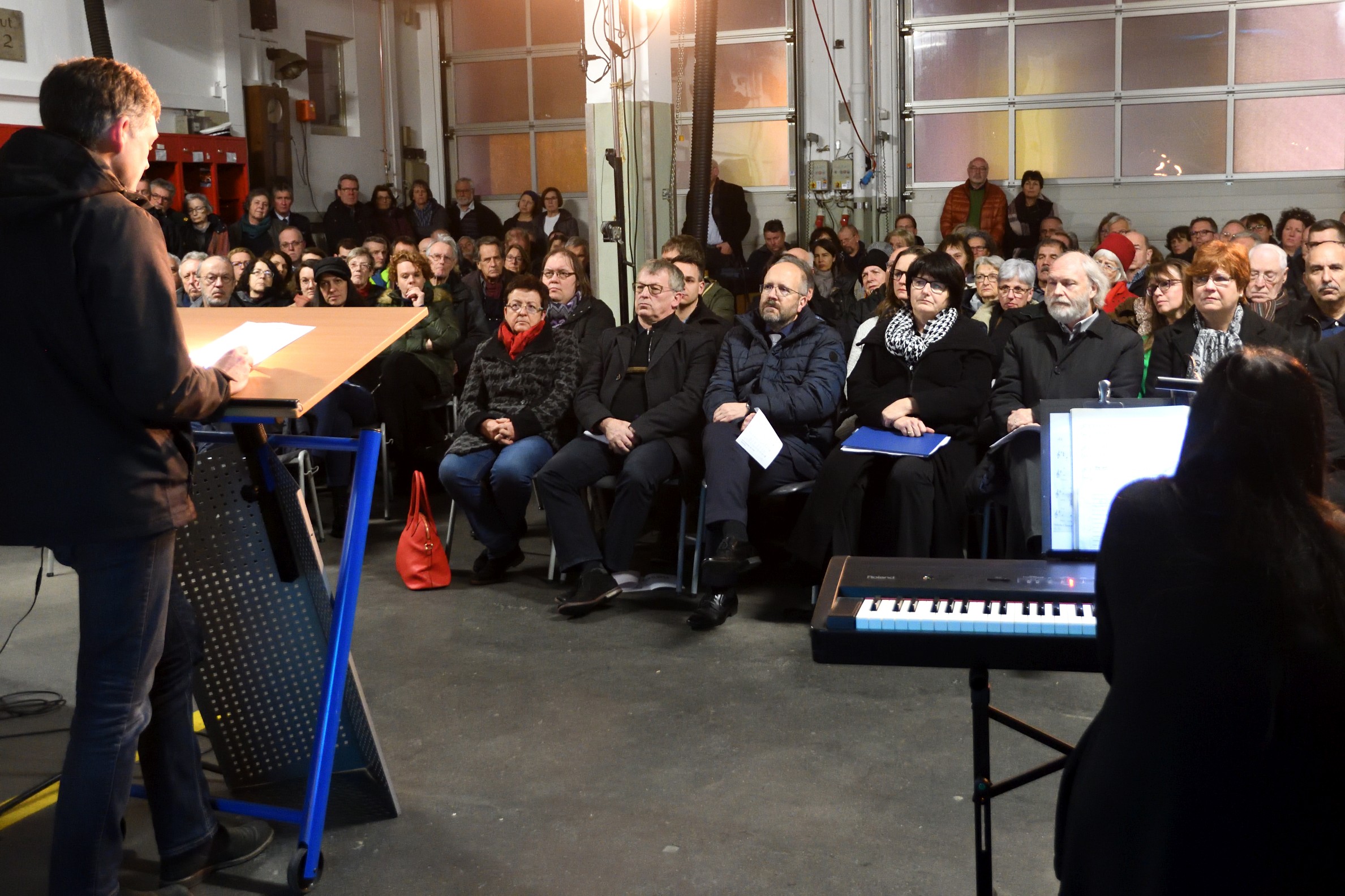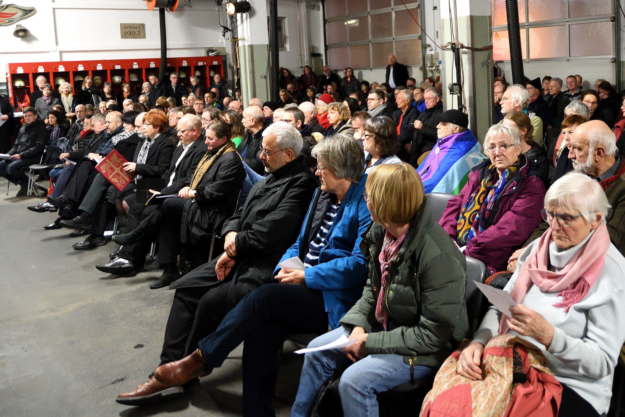 Viele blieben, um danach noch die Lesung aus Biographien von Familien, für die Stolpersteine gelegt worden waren und das Theaterstück „Auschwitz meine Liebe“ von der Badischen Landesbühne zu erleben, das zwischen Schläuchen und Feuerwehruniformen an diesem ganz bewusst gewählten Ort der ehemaligen Synagoge besonders eindrücklich rüberkam.