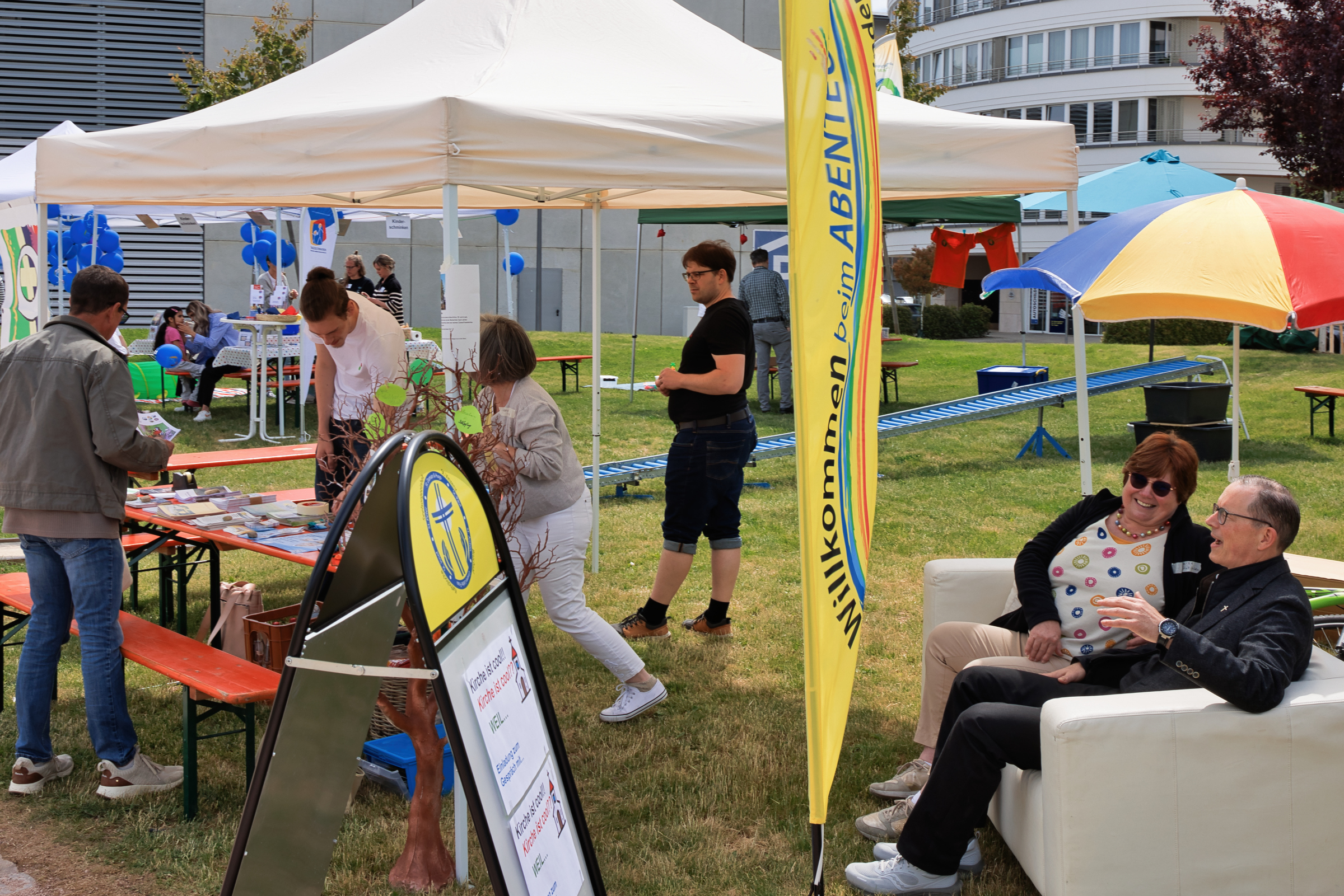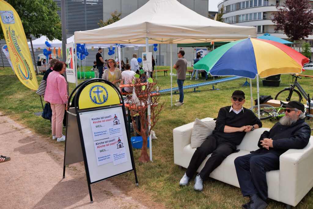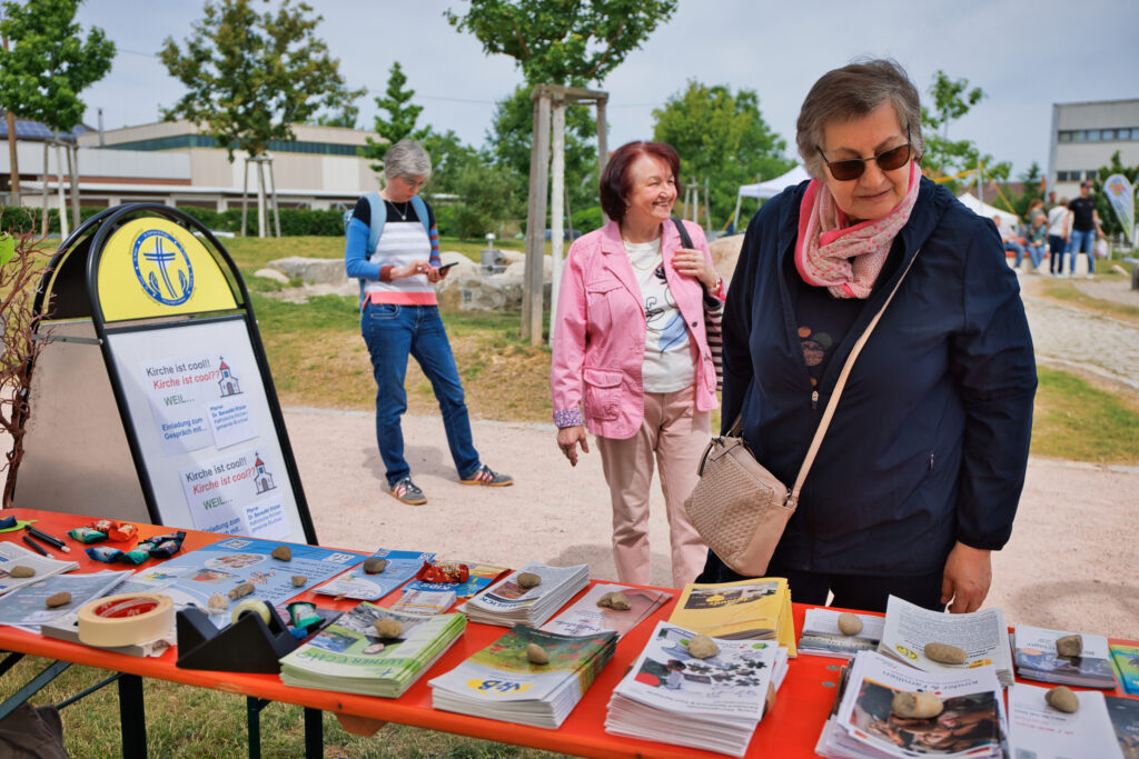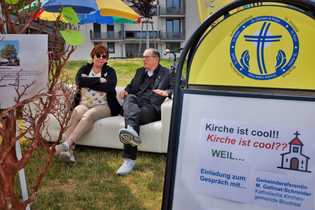 Am Stand der ACG gab es die Möglichkeit, auf dem Sofa Platz zu nehmen und mit pastoralen Mitarbeitenden über Kirche zu plaudern, es gab eine Rollenrutsche für Kinder, es gab einen Wunschbaum, an den Blätter mit Wünschen gehängt werden konnten. Diese Wünsche sollen in Fürbitten umformuliert werden. Daneben gab es eine Auslage mit Gemeindebriefen und Flyern der vielfältigen Gottesdienste und Kreise in den verschiedenen Pfarreien. So wollten wir die Menschen, die neu nach Bruchsal gezogen sind, willkommen heißen und zeigen, wie vielfältig und bunt unsere Angebote sind.