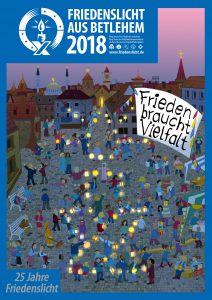 Friede, der alles Verstehen übersteigt, das kann nur himmlischer Friede sein. Aber damit dürfen wir uns nicht begnügen, wir müssen dennoch hier etwas dafür tun. So wie die Pfadfinder. Heute findet zum 25. Mal die Friedenslichtaussendung statt, 25 Jahre erinnert das kleine Licht aus Bethlehem nun schon an den Wunsch nach Frieden. Vielfalt der Religionen, wie sie auf dem Plakat zu sehen ist, ist leider auch heute oft nur ein Wunschtraum!