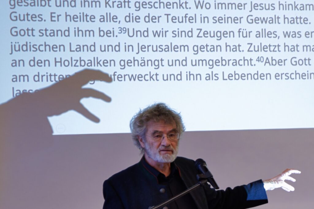 Nach einer Andacht zu Beginn, in der Johannes Vortisch an den Bericht über die Himmelfahrt und die Paternoster-Kirche in Jerusalem erinnerte, führte Professor Reinhard Feldmeier den Zuhörerinnen und Zuhörern mitreißend und anschaulich vor Augen, was wir diesem Lukas, dessen Gedenktag die katholische Kirche am 18. Oktober feierte, alles verdanken. Zunächst einmal wäre Weihnachten ohne ihn nicht denkbar, aber auch die marianische Frömmigkeit, die Befreiungstheologie, der kirchliche Jahreskreis mit seinen Festtagen, unsere Zeitrechnung, das Gloria, Johannes der Täufer – so vieles geht auf ihn zurück.