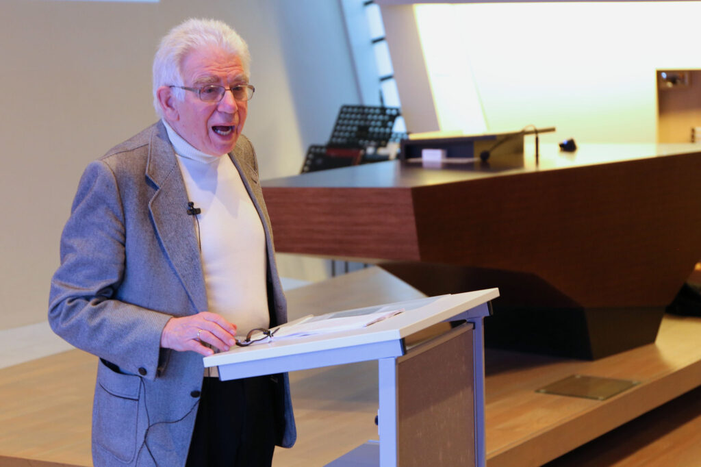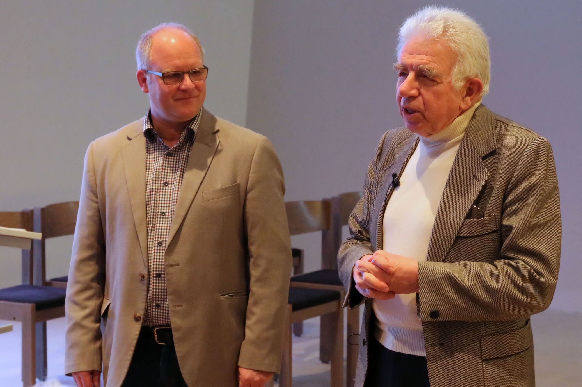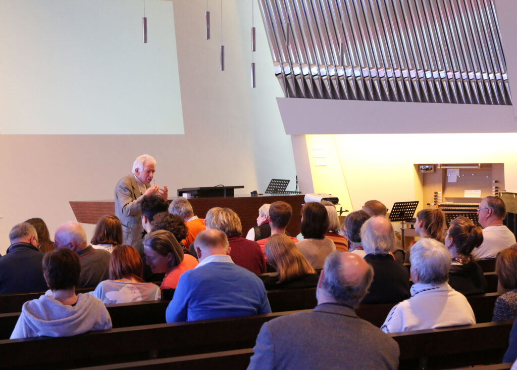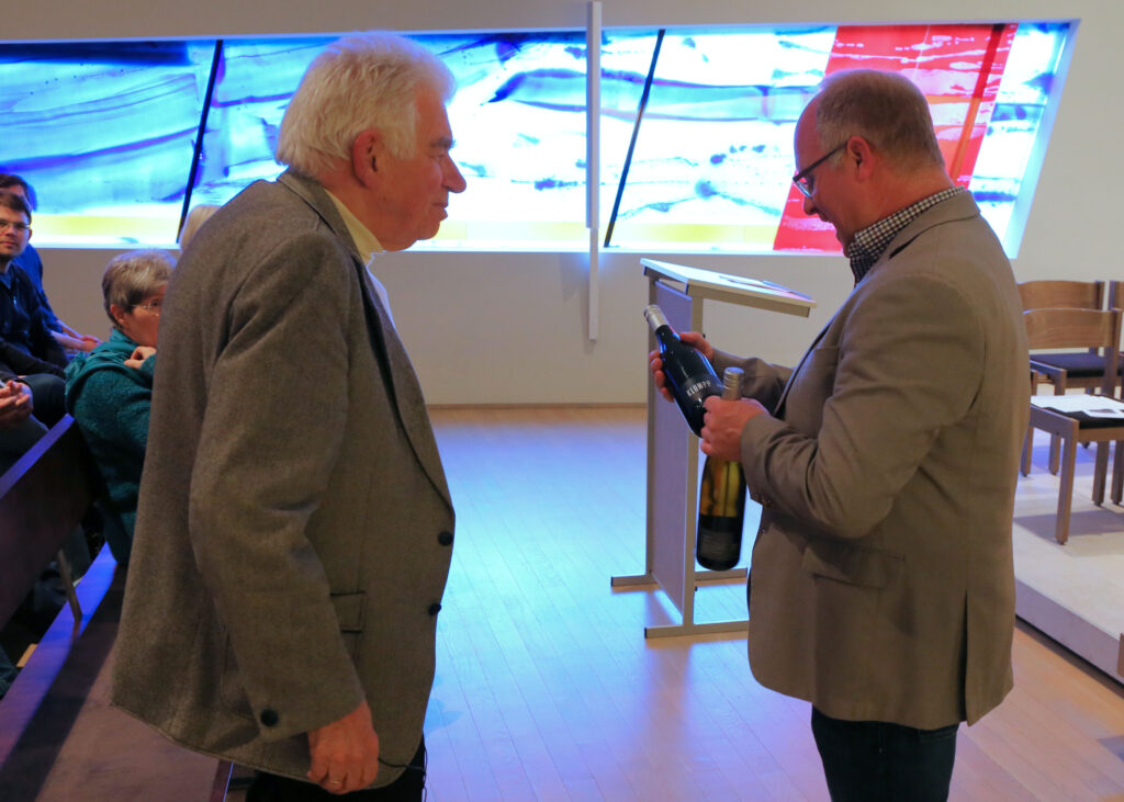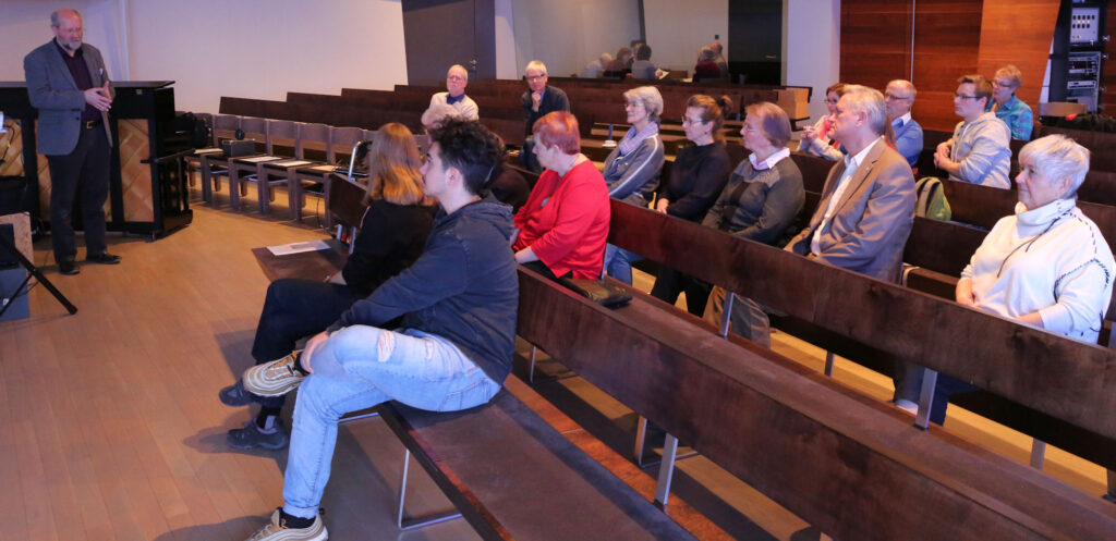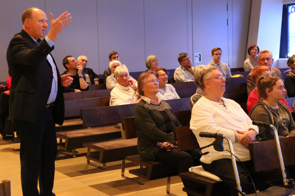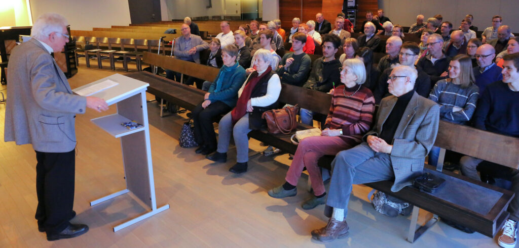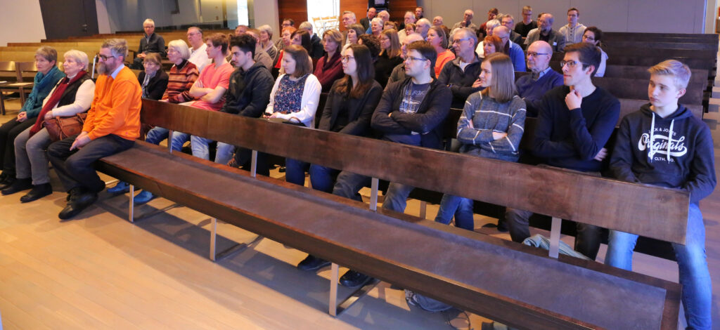 Den Nachmittag eröffnete dann der Hausherr, Gemeindevorsteher Frank Arlaud, in dem er die Architektur des Kirchengebäudes erläuterte, die ebenfalls Jesu, das Kreuz und die Größe Gottes in den Mittelpunkt rücken soll. Der Nachmittagsvortrag von Bischof Klaiber hatte das Thema „Für uns gestorben!? Von der existentiellen Bedeutung des Kreuzes für uns heute“. Dank seines Wissens ein erneut beeindruckendes Erlebnis, das vielen Zuhörern noch lange im Gedächtnis bleiben dürfte.
