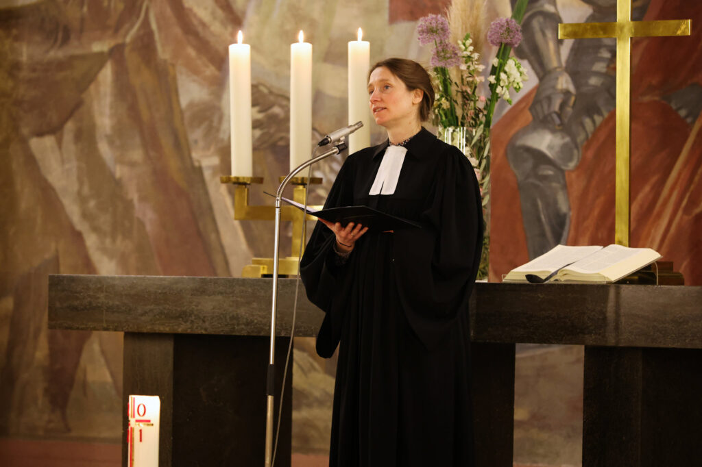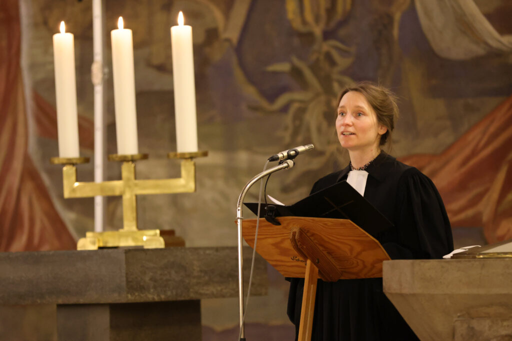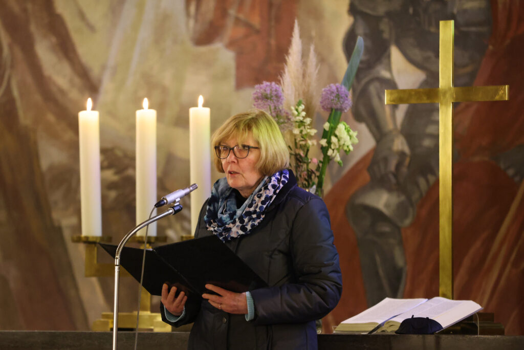 In der Lutherkirche lasen Pfarrerin Susanne Knoch und Gemeindereferentin Marieluise Gallinat-Schneider Worte des Friedens vor. Die Ereignisse lassen uns verstummen. Diese Ohnmacht wurde in Lied und Gebet vor Gott gebracht. Abwechselnd wurden Abschnitte aus dem Alten und Neuen Testament und andere Texte vorgetragen. Erika Gerken bat in den Fürbitten für alle Opfer dieses gewaltsamen Konfliktes und gab ihnen eine Stimme.