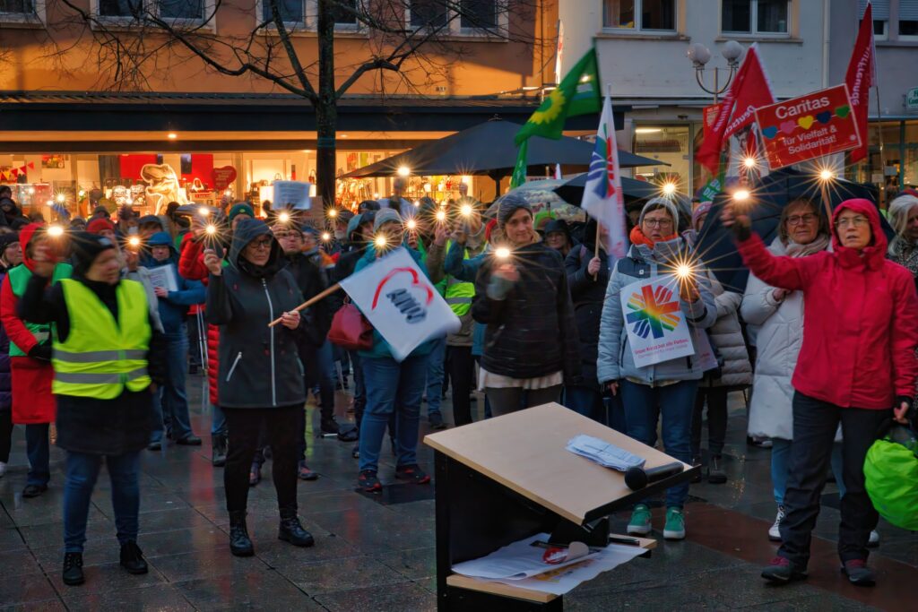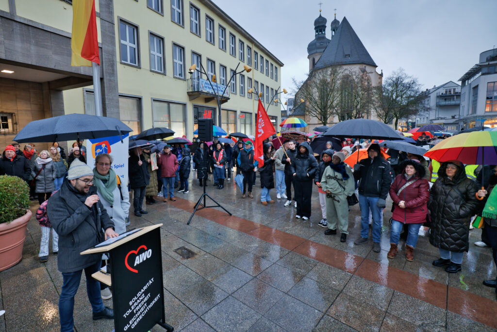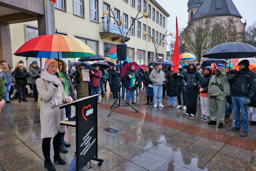 Eingeladen hatten AWO, Caritas und Tageselternverein. Alles demokratischen Parteien, Kirchen, Gewerkschaften und soziale Organisationen wie Diakonie und Lebenshilfe waren dem Aufruf gefolgt. Leider zog die CDU ihre Beteiligung kurzfristig wieder zurück. Aber alle anderen Parteien: SPD, Grüne, Linke, FDP, dazu Caritas, AWO, Parents for future, Migrationsbeirat und ACG bekräftigten in ihren Reden den Zusammenhalt der Gesellschaft, die Menschenwürde, Inklusion, Klimagerechtigkeit und den Wert von Demokratie.