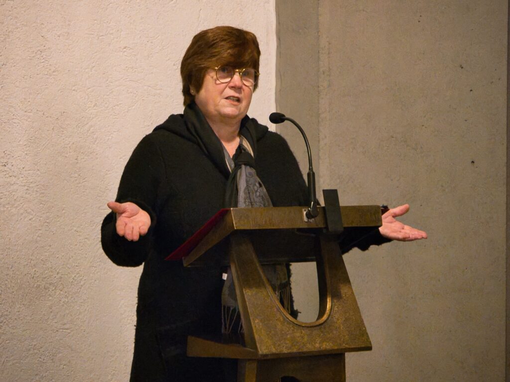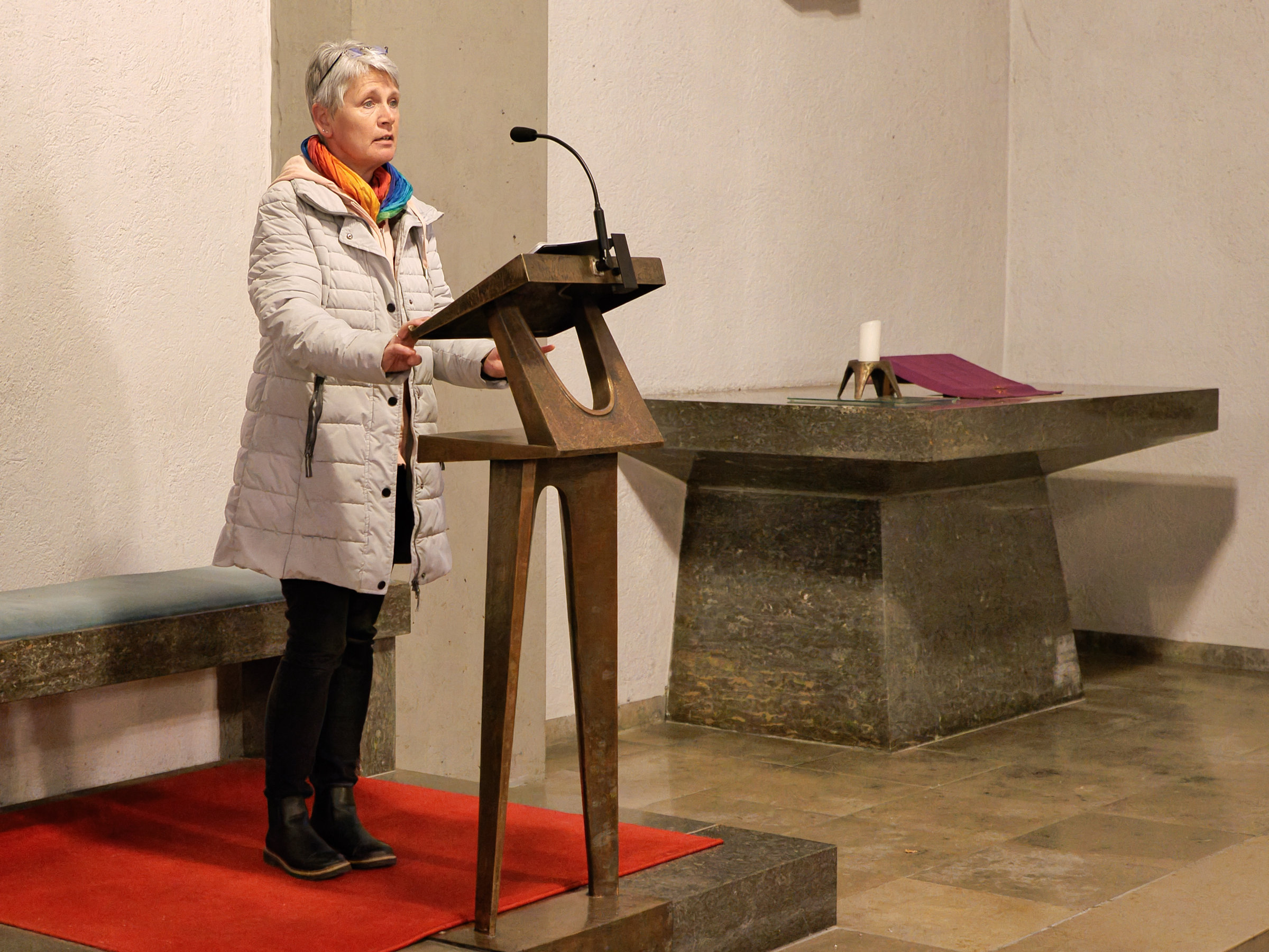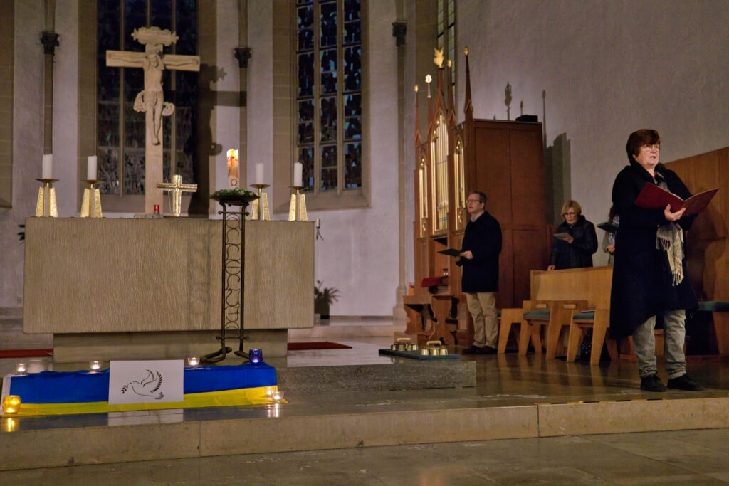 Vor dem Altar die ukrainische Flagge, einige Kerzen umrahmen die zentrale Friedenstaube: Gemeindereferentin Marieluise Gallinat-Schneider hatte gemeinsam mit einigen Vertretern von der Arbeitsgemeinschaft Christlicher Kirchen in Deutschland (ACG) ein passendes kleines Programm entworfen. Musikalisch unterstützt von Susanne Mientus sangen die Kirchenbesucher etwa den Kyrieruf mit ukrainischer Melodie oder das Segenslied „Herr, wir bitten: komm und segne uns, lege auf uns deinen Frieden“. Die Liedbeiträge wechselten sich mit Kurztexten ab, wie beispielsweise einem Impuls von Gemeindeassistentin Nathalie Ockenfuß von der Seelsorgeeinheit St. Vinzenz. Die Fürbitten verlas Erika Gerken für die ACG Bruchsal, wie jedes Mal beim Friedensgebet aktuell und passend ausgewählt und zusammengestellt. Mit dem eindringlichen „Vater-vergib!“-Gebet aus Coventry, das Lukas Baden von der Luthergemeinde anstimmte, oder der mutmachenden Ansprache von Sven Gärtner von der FeG fügten sich die einzelnen Beiträge zu einem starken, tröstlichen Zeichen für den Frieden. Im Anschluss trafen sich die Teilnehmer zwischen Kirche und Rathaus noch zu einer Mahnwache, die von der Friedensbewegung und politischen Gruppen unterstützt wurde. Das letzte Wort hatte hier dann John Lennon mit seinem hoffungsvoll-zeitlosen Song, der zum Abschluss über den Marktplatz klang: „Imagine“.